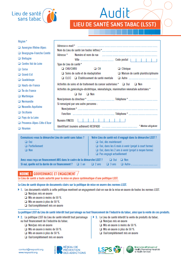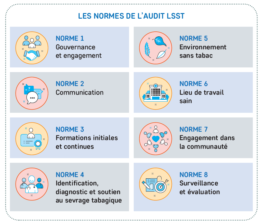 L’Audit LSST, qui est également utilisé à l’échelle internationale par le Global Network of Tobacco Free Healthcare Services (GNTH), permet d’évaluer huit normes, grâce à 47 questions, et ainsi explorer les différents aspects constitutifs de cette stratégie.